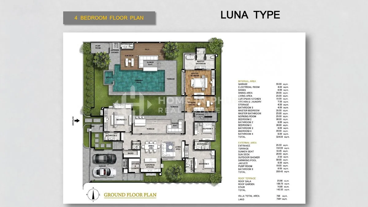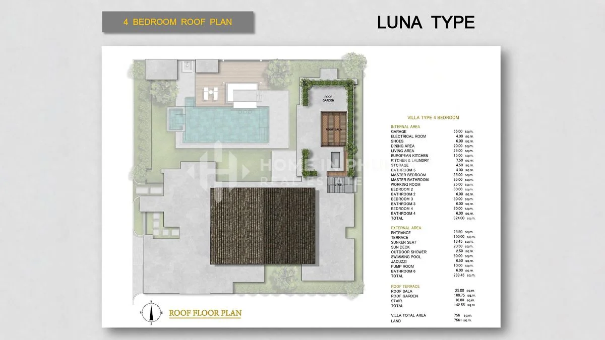 This Private Pool Villa / House with 4 bedroom and 6 bathroom is part of the Luna Vista project in Thep Krasatti, Thalang District, Phuket. The Villa / House features built-up area of 503.45 sqm across 1 floor and 665.46 sqm plot area, includes Private Pool, 2 car parking and is Off-Plan.