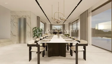 The villa features a striking ultra-modern architectural design with distinctive rounded corners, creating a bold yet elegant contemporary character. This design language continues throughout the interiors, complemented by stylish finishes and refined decorative details.