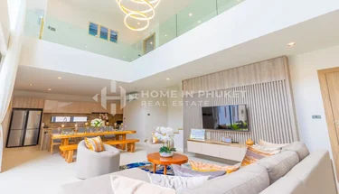 The villa features 342 sqm of built-up area on land plot at 259 sqm. The ground floor includes an open-plan living and dining area with soaring double-height ceilings and floor-to-ceiling windows, creating a bright and airy atmosphere. A fully equipped Western kitchen with an island and a guest restroom complete the main living space. The master bedroom offers a walk-in wardrobe and an ensuite bathroom with a separate bathtub and shower.