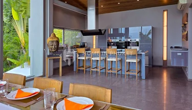 There are three bedrooms on the ground floor, all very spacious with ensuite bathrooms featuring showers and/or bathtubs. The open-style Western kitchen is fully equipped and includes a bar counter.