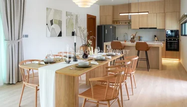 The villa offers a bright open-plan living and dining area with a fully equipped kitchen. Both bedrooms are ensuite, with the master bedroom including a walk-in closet. Large sliding glass doors open from the living area onto the pool deck, where a 3 × 6 m private swimming pool and landscaped garden create a serene outdoor retreat. Additional features include a covered car park for one vehicle.