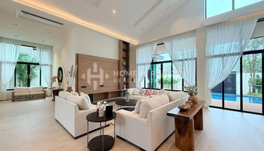 The villa welcomes you with a spacious open-plan living area featuring high ceilings and a foyer that flows seamlessly into the family lounge, dining space, and a large fully equipped kitchen—ideal for everyday living and entertaining. Floor-to-ceiling sliding doors connect the interior to the outdoor terrace and private swimming pool, enhancing the indoor–outdoor lifestyle.