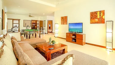 Entry to the villa is on the upper level which features an open living area with ample seating, a fully-equipped kitchen, a cozy sitting area, 1 small bedroom, a master bedroom with ensuite bathroom and walk-in closet and a spacious undercover balcony with comfortable seating and a 12-seat dining table.