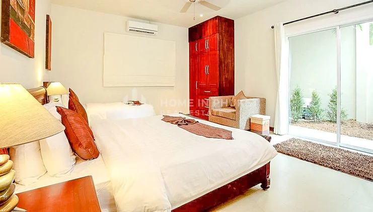 Located in a peaceful gated community area within close proximity to Nai Harn beach, is this spacious seven-bedroom villa on a gentle slope, featuring 650 sqm of total built-up area over two levels on a 750 sqm land plot.