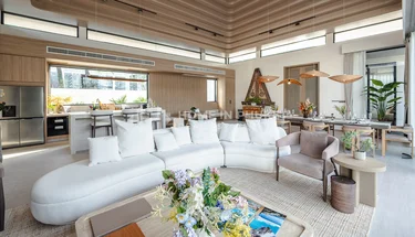 主生活区明亮通风,拥有挑高的拱形天花板和开放式布局,将客厅、用餐区和设备齐全的西式厨房紧密相连。中央岛台和早餐区兼具功能性与设计感,是日常居住和招待宾客的理想空间。